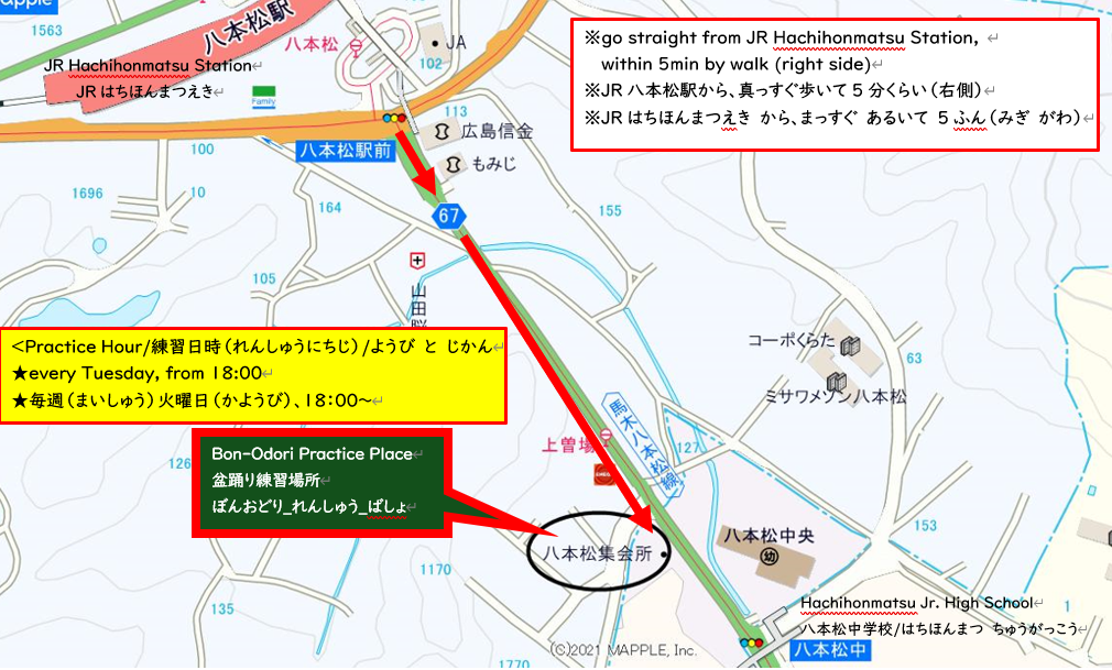 8月の夏まつりに向けて、7月の毎週火曜夕方6時~、八本松集会所で盆踊り練習会があります。是非外国人市民の方にもご参加頂きたい!ということで、外国人市民対象の呼びかけ用に練習会のチラシなどを作成しました。八本松在住の外国人市民の方、八本松在住じゃない外国人市民の方もチラ見でもしてくれますように!(※八本松夏まつりは、8月12日(月)15:00~)