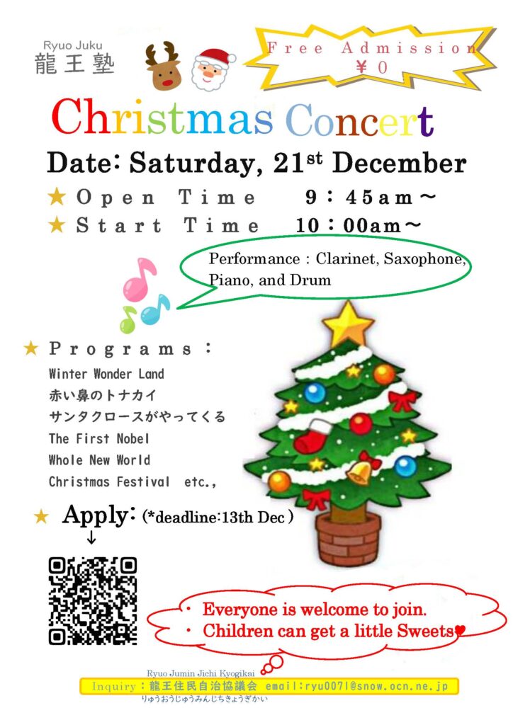 12月21日(土曜)10:00~、龍王小学校の体育館で、「クリスマスコンサート」が開催されます。外国人市民の皆さんにも参加して頂けるように、英語とやさしいにほんごでチラシ作成をさせて頂きました。先日(11月24日日曜)開催された「親子で遊ぼうinりゅうおう」には、外国人親子が5組参加されました。嬉しい…(感)こうした何気ない日常のイベントに外国人市民の方々が参加出来ること、それが真の多文化共生だと思います。大変地道ではありますが、コツコツ続けていきたいと思います。