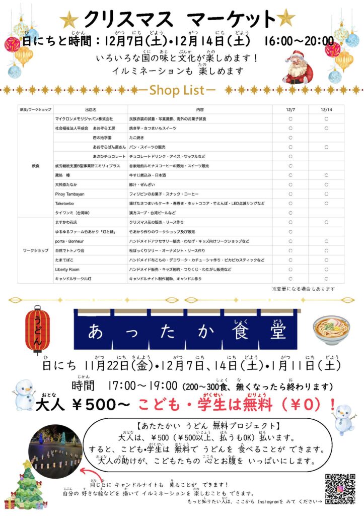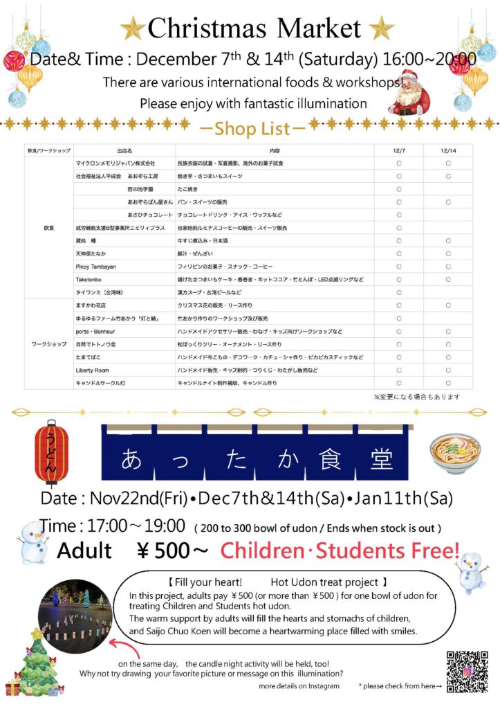 毎年開催される冬のライトアップ&クリスマスマーケットのチラシを英語で作成させて頂きました。今年も「ごちうどんプロジェクト(Hot Udon Treat)」もあります。冬のイルミネーション、クリスマスマーケット、そして、うどん、外国人市民の皆さんも楽しんでいただけますように。