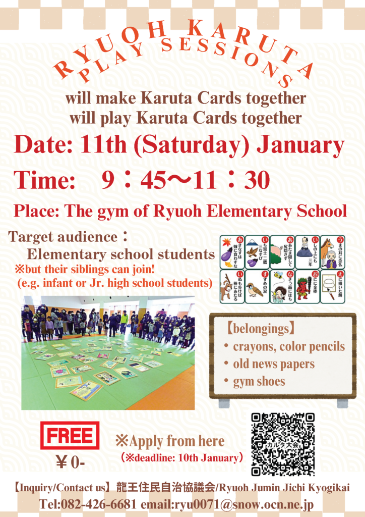 1月11日(土曜)9:45~、龍王小学校の体育館で、「新春龍王カルタ大会」が開催されます。今回も、英語とやさしいにほんごでチラシを作成させて頂きました。今週土曜のクリスマスコンサートには、6組の外国人市民家族の申込があるそうです。外国人市民やそのご家族が、日常の日本を普通に楽しめるよう、コツコツ頑張ります。