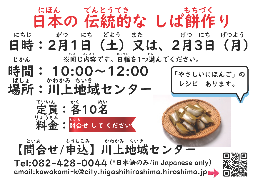 2月1日土曜、又は、3日月曜(*どちらか選択)、10:00~12:00、川上地域センターで、『伝統的なしば餅作り』をします。外国人市民の方にも参加して頂けるよう、やさしいにほんごでチラシとレシピを作成させて頂きました。講義が日本語のみなので、日本語ゼロの方には難しいですが、簡単な日本語が分かれば、外国人市民の方も楽しめます。日本人でもなかなか作る事がない「しば餅」(私も知りませんでした)。外国人市民の方が、興味を持って参加してくれますように。