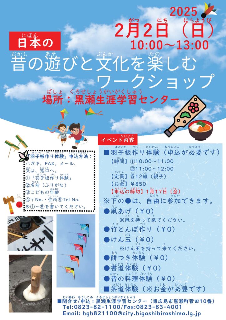 2月2日(日曜)10:00~13:00、黒瀬生涯学習センターで、「昔遊びと日本文化のわくわくプロジェクト」が開催されます。書道や餅つき、凧あげ、けん玉、竹トンボなど、ワークショップもたくさんあります。「羽子板作り体験」のみ、事前申込が必要で、年末に急いで英語とやさにちチラシを作成させて頂きました。黒瀬在住の外国人市民の皆様、黒瀬在住じゃない外国人市民の皆様の目にも留まりますように。※追って、ベトナム語のチラシも作成させて頂きます。