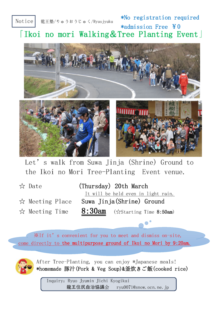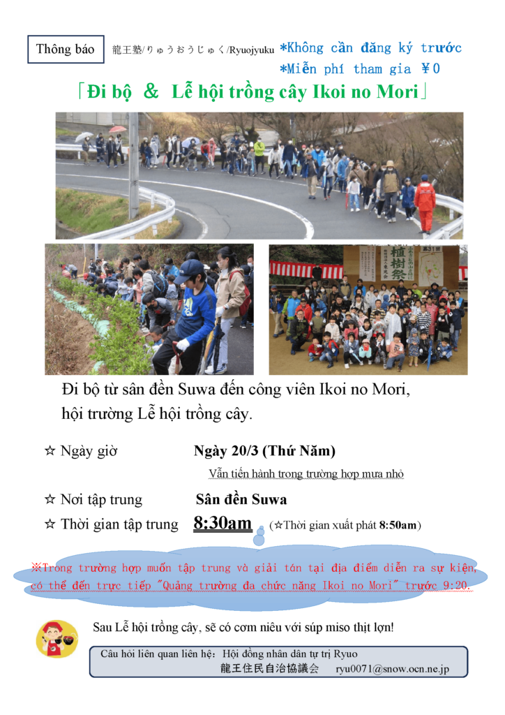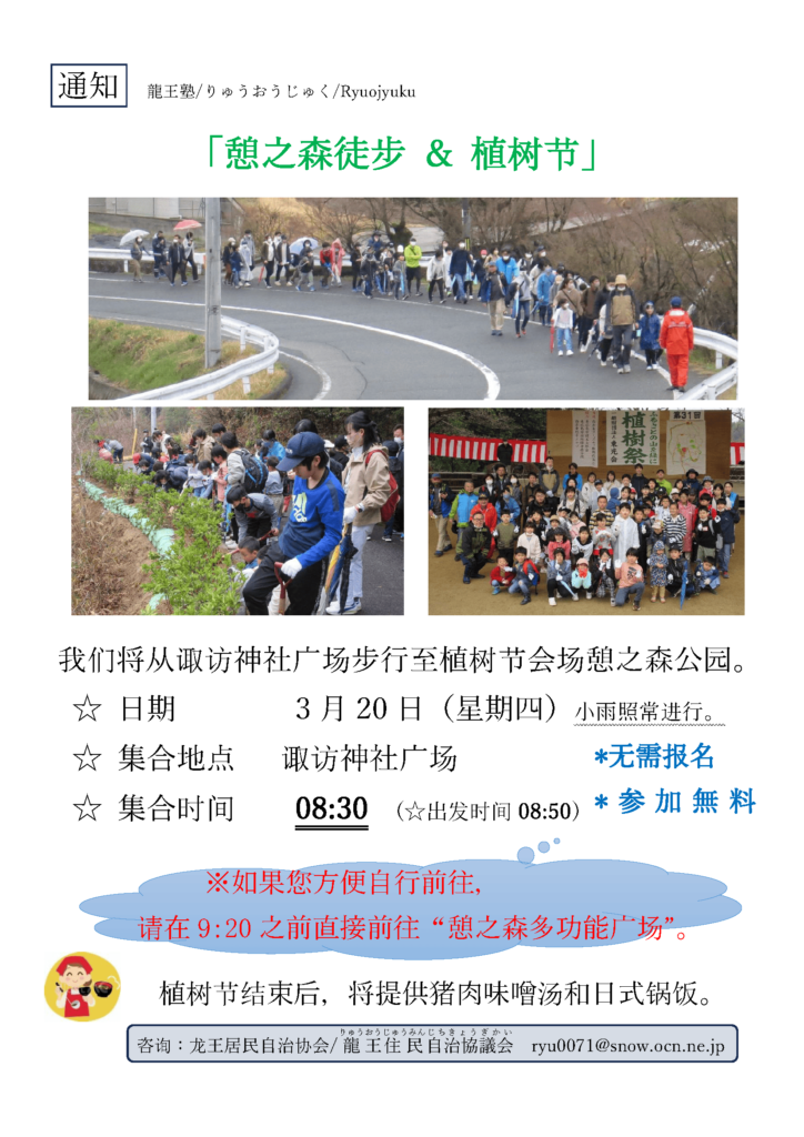 3月20日(木/祝日)、「憩いの森ウォーキング&植樹祭」が開催されます。小学生児童のみでなく、地域全体に向けてのイベントです。龍王地区は、中国、ベトナムの外国人住民が多いので、チラシも中国語とベトナム語も併せて作成させて頂きました。外国人住民の方々も参加してくれますように。