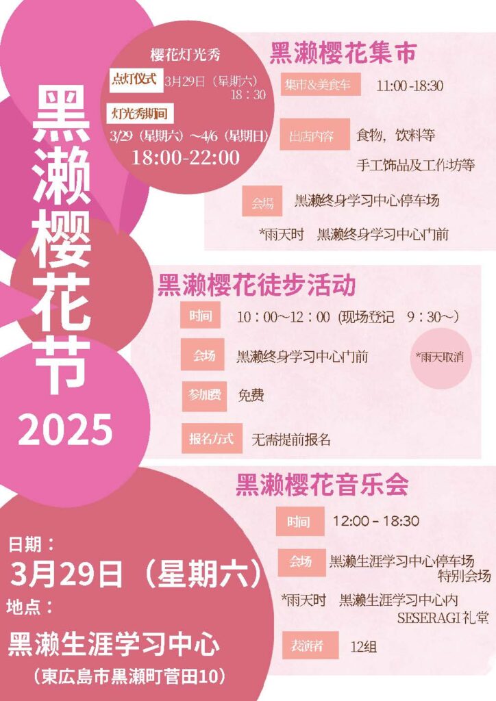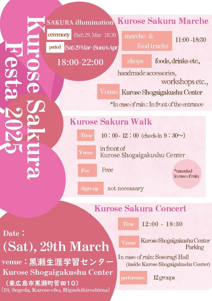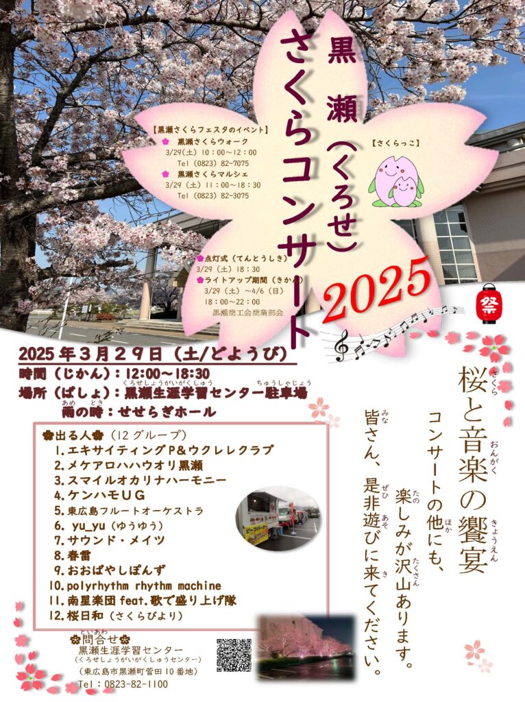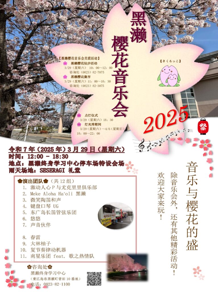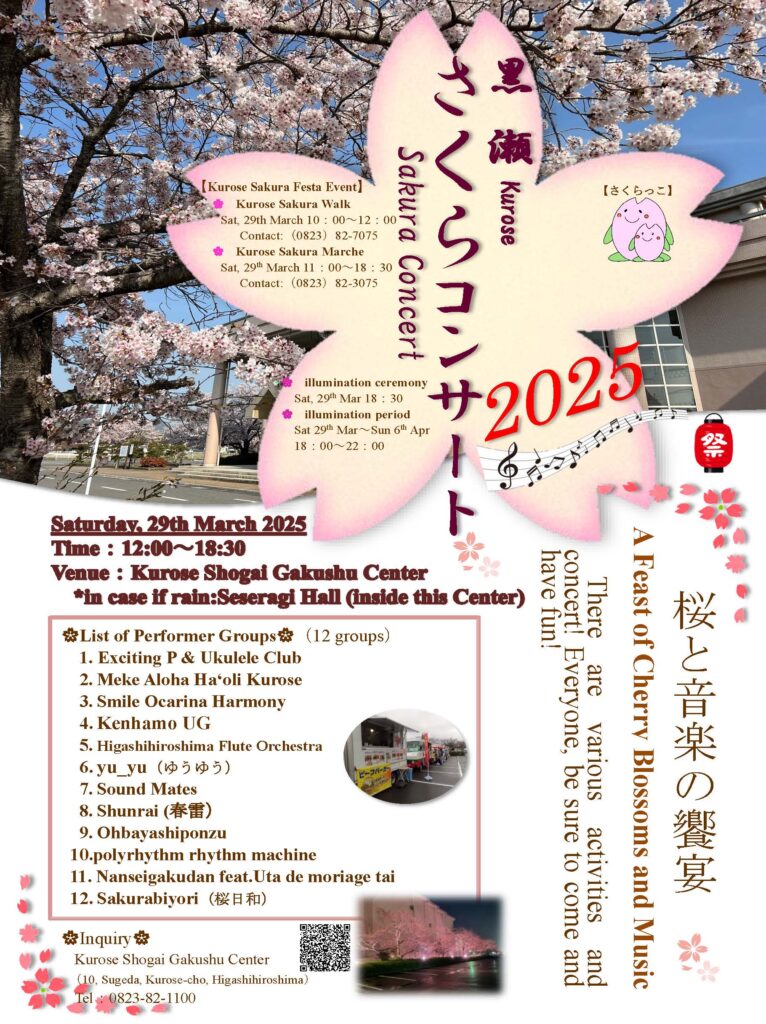 3月25日土曜日、15:00~20:00、黒瀬生涯学習センターで 黒瀬桜コンサートがあります。お花見をしながらコンサートも楽しめます。入場無料です。夜にはライトアップされます。このイベントに外国人の方々にも参加して頂きたく、黒瀬生涯学習センターは、多言語で案内チラシも作りました。皆さんのご来場をお待ちしております。