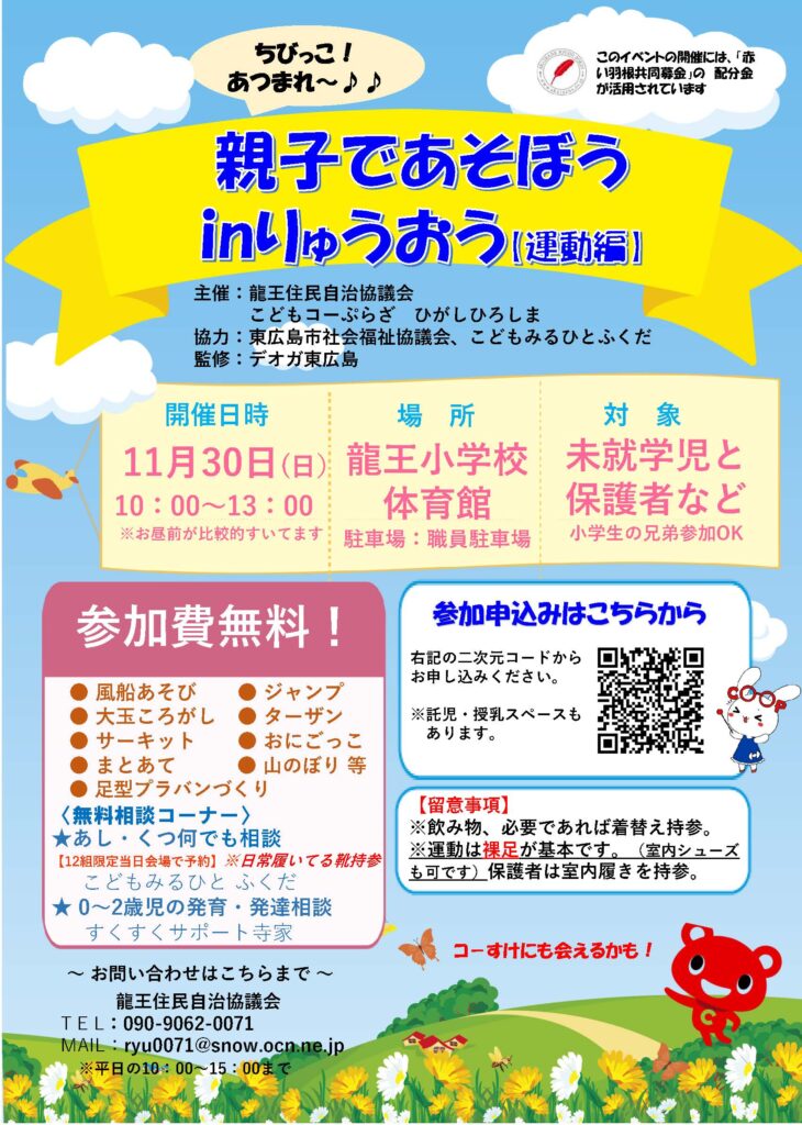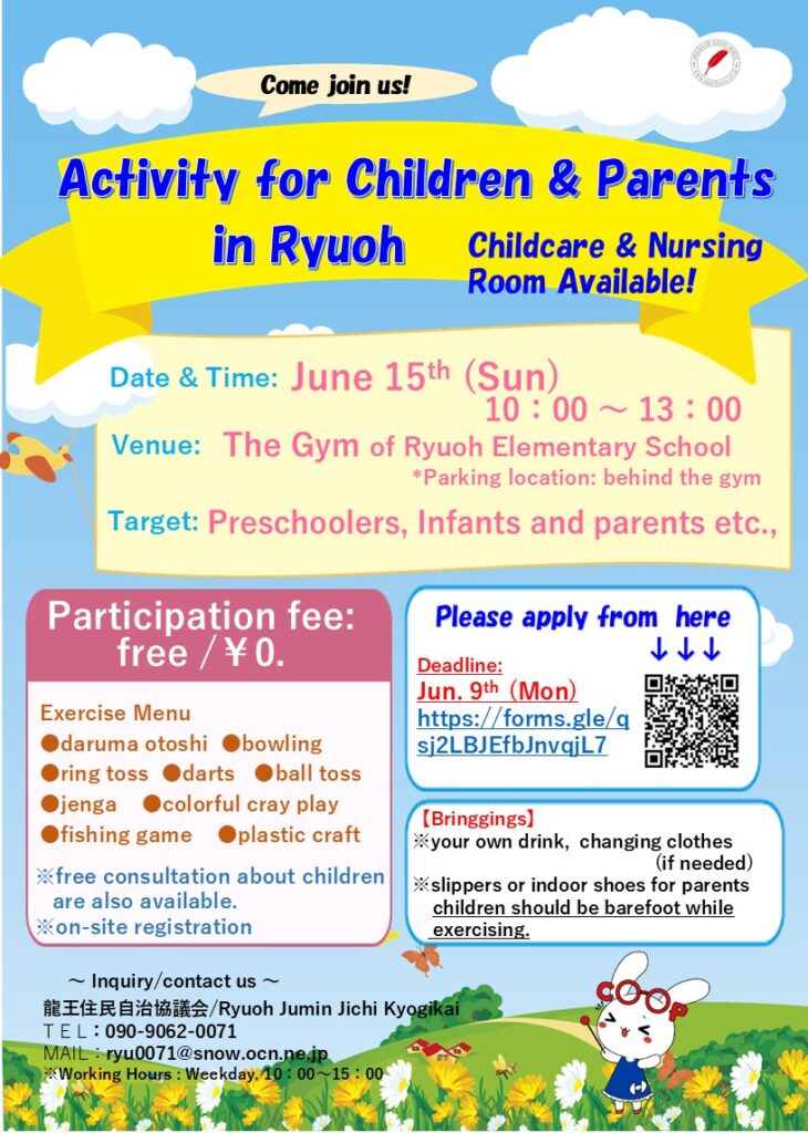 6月15日日曜、10:00~13:00、「親子であそぼうinりゅうおう」が今年も開催されます。昨年度同様、6月(前半)は「遊び編」です。今年度は「遊び編」のチラシ編集もさせていただくことが出来ました。コミュニケーションコーナーから情報発信をさせていただきます。こういった日常のイベントに外国人市民の方がサクッと参加できることこそが、共生だと思います。多文化なんて関係ないと思います。東広島市在住の外国人市民の皆さん、皆さんが楽しめそうな情報を力いっぱい投げるので、「目と耳かっぴらいてゲット!」してください!!