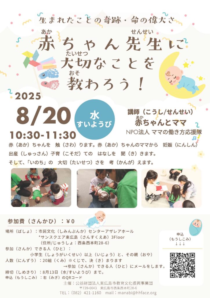 8月20日水曜日、10:30-11:30、「赤ちゃん先生に大切なことを教わろう!」があります。小学生以上対象で、親と一緒でも、親子ででも参加できます。赤ちゃんを触ったり、抱っこしたり、赤ちゃんのママから、赤ちゃんの話を聞きます。外国人のこどもさんにも関心を持ってもらえたら、ということで、「やさしいにほんご」チラシを作成させていただきました。少しでも日本語がわかる外国人のこどもさんや親御さんに興味を持ってもらえたら、うれしいです。
