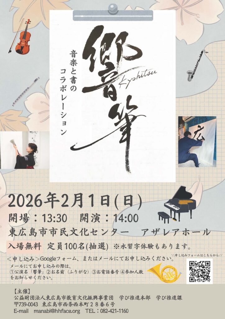 2月1日日曜、14:00~、市民文化センター3階、アザレアホールで、「響筆~音楽と書のコラボレーション」鑑賞イベントです。水習字の体験もできます。入場無料、要申込(抽選)。外国人市民の皆さんにも来て観ていただきたく、チラシを英訳させていただきました。アンサンブル演奏に合わせての書道パフォーマンス。少しでも関心のある外国人市民の方にも情報が届きますように。(※いつも通り、コミュニケーションコーナーのSNSでも情報発信させていただきます。)