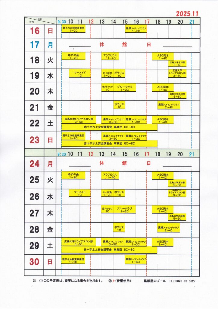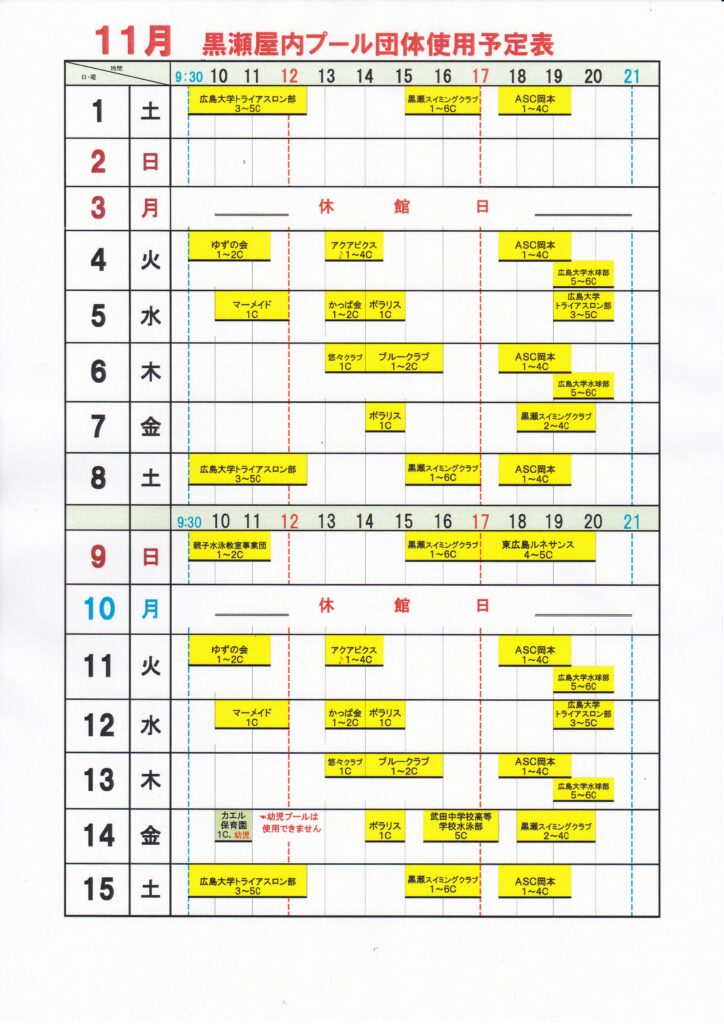 黒瀬屋内プール団体使用予定表11月分を掲載します。