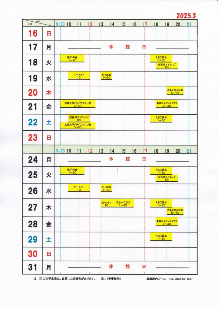 黒瀬屋内プール団体使用予定表3月分