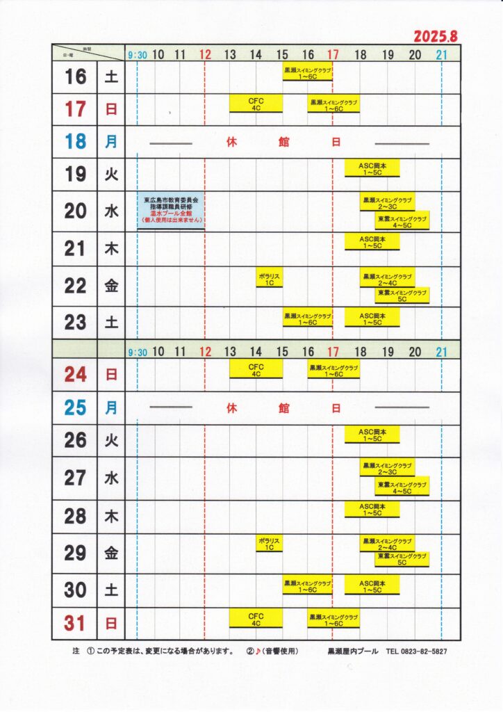 黒瀬屋内プール団体使用予定表8月分を掲載します。