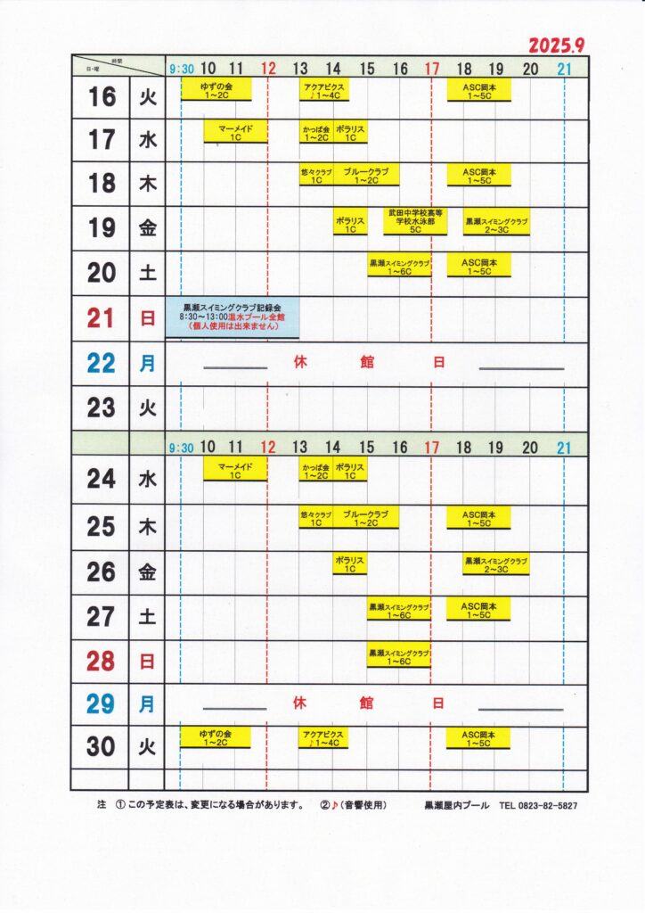 黒瀬屋内プール団体使用予定表9月分