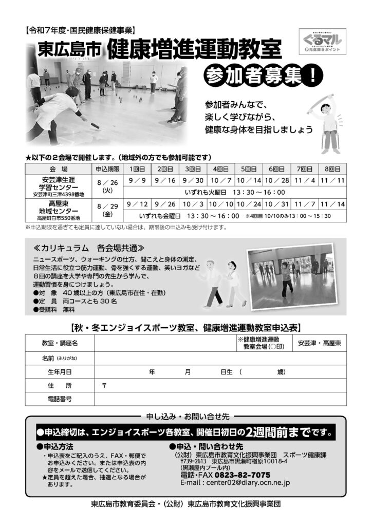 9月から順次開催する【エンジョイスポーツ教室】【健康増進運動教室】の受講生を募集します。