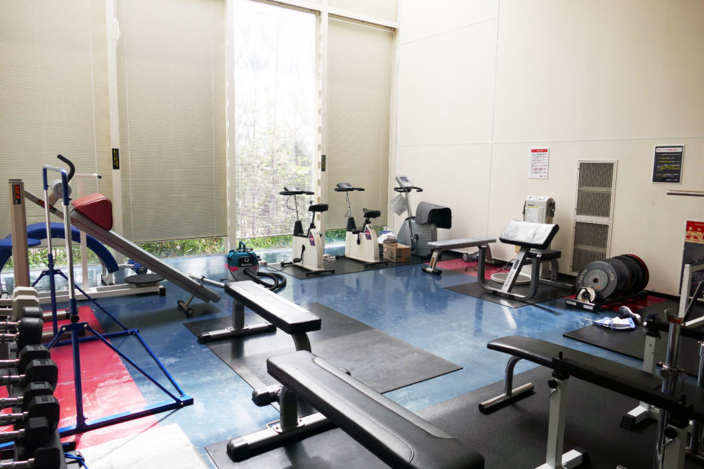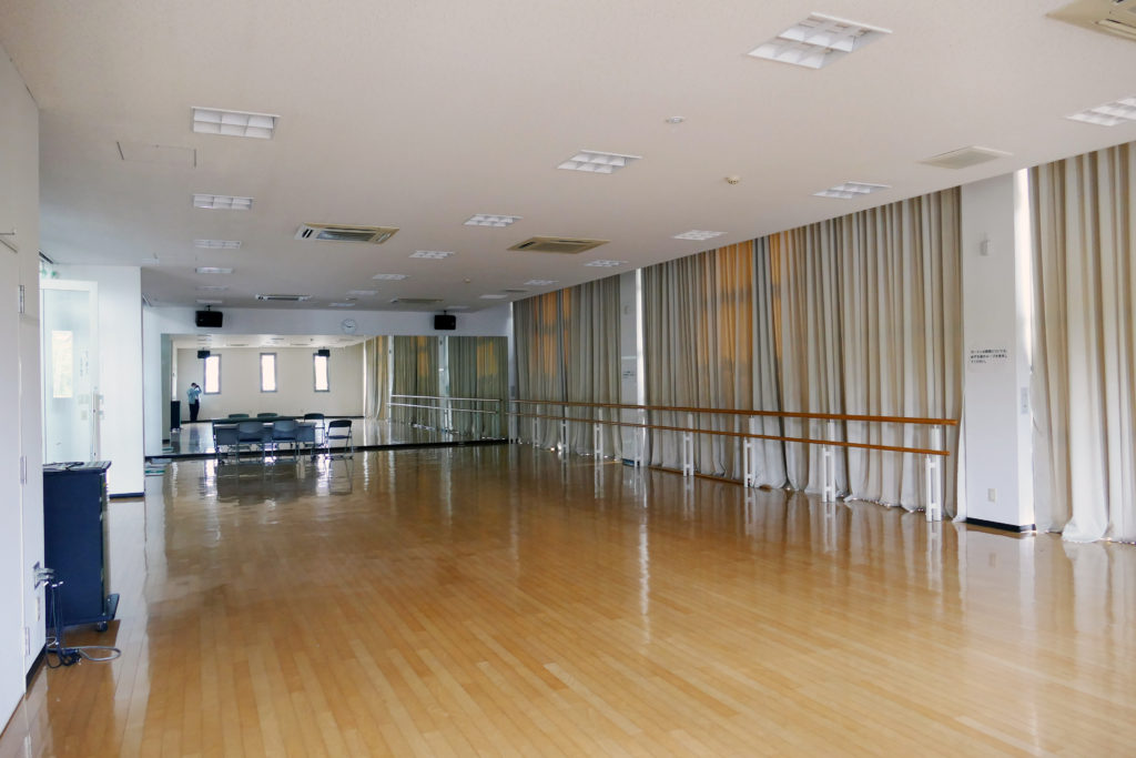 フロアーは、クッション性の板で、冷暖房を完備しています。部屋の前面は鏡張りです。